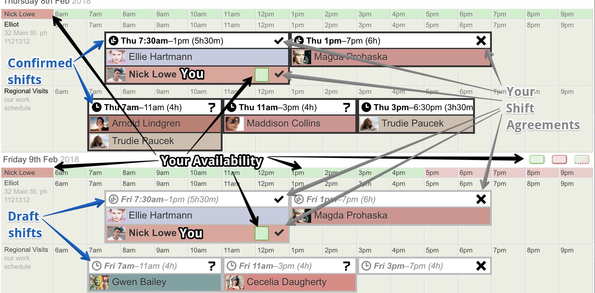 You can register your availability in advance. Using the controls on the schedule, you can indicate yourself as available(green/free to work) or unavailable(red/busy).